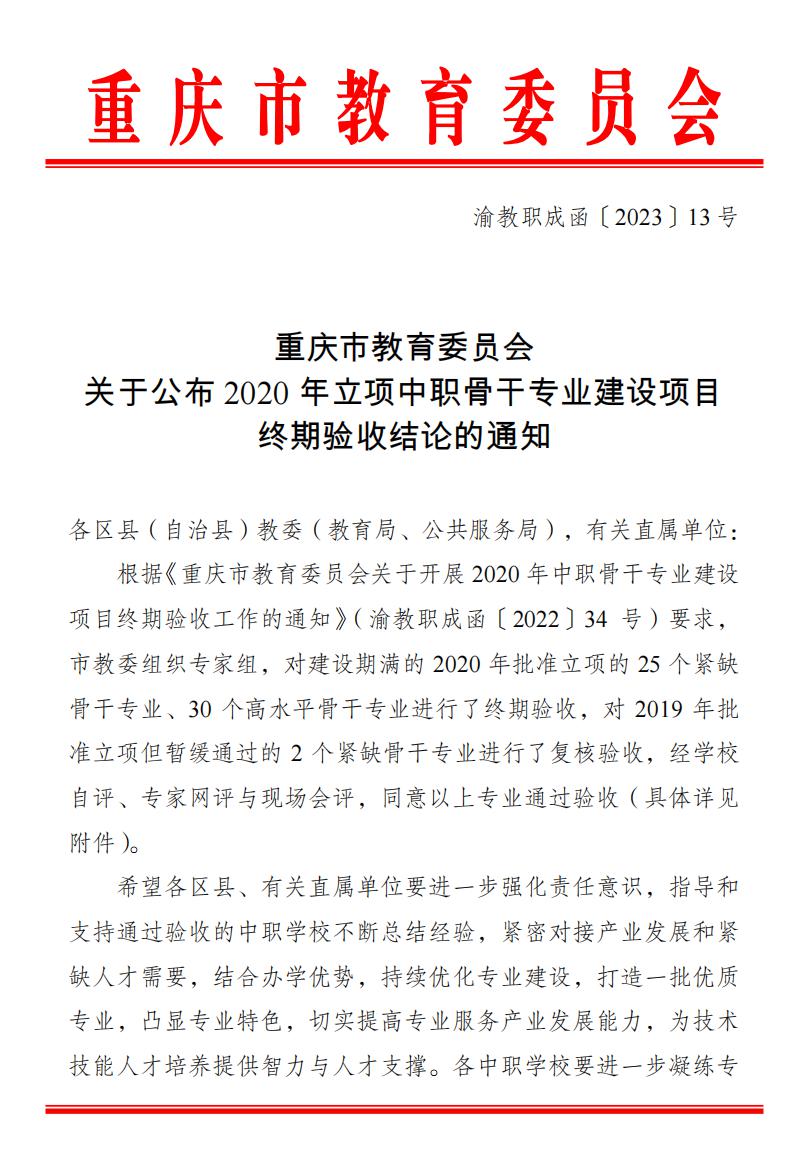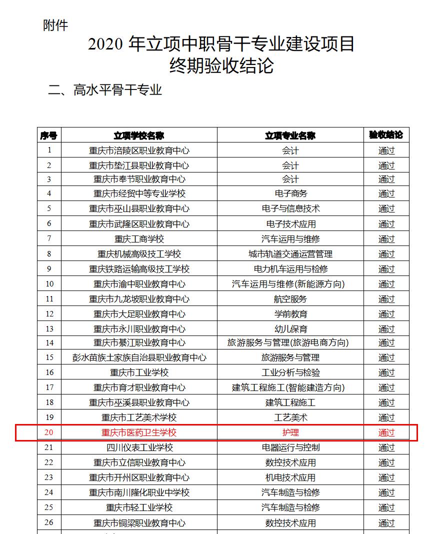 护理专业2020年获批重庆市中职高水平骨干专业建设项目,历时两年建设,通过了市教委组织的终期验收,成为市级中职高水平骨干专业。